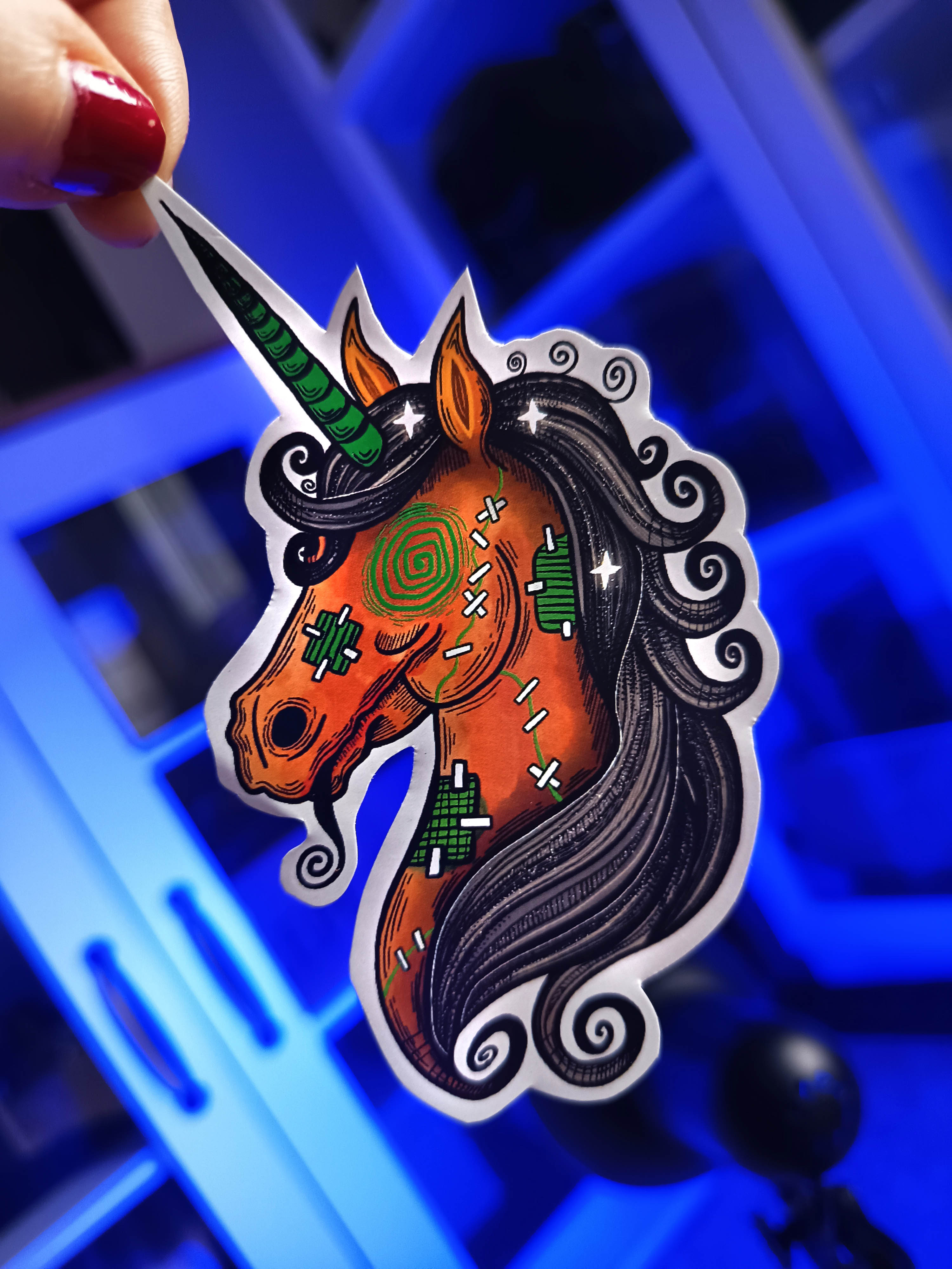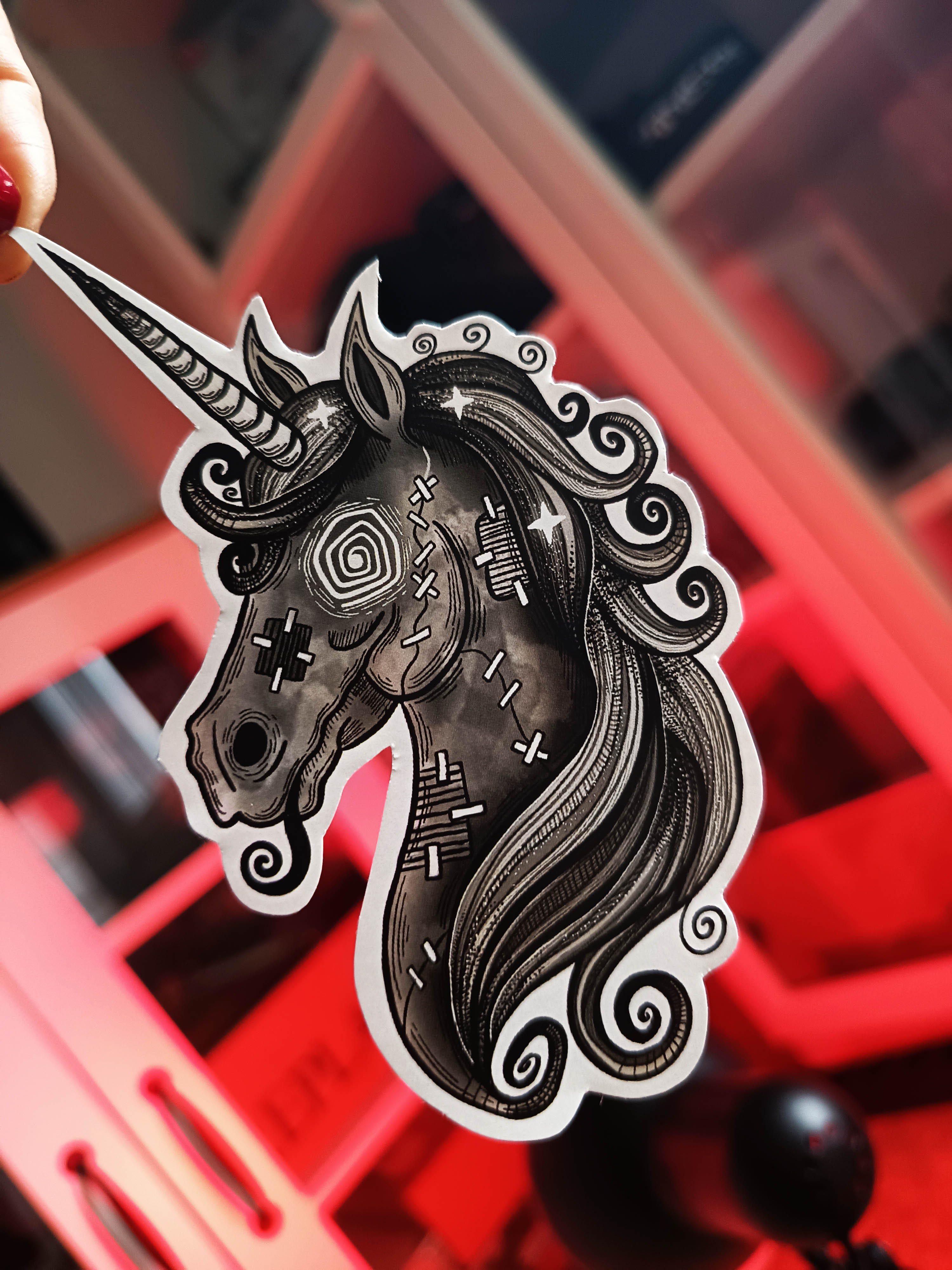 Each one is cut out by hand and printed on shiny sticker paper.